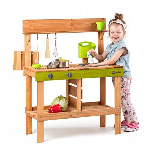 Z jedné strany kuchyňka se dvěma vařiči, z druhé výdejna jídel. Součástí kuchyňky je zásobník na vodu, díky kterému může dítě skutečně mýt ovoce, zeleninu, ale také nádobí a náčiní, které je součástí tohoto výrobku. Hra s vodou děti nadchne a plnění zásobníku se tak stane velmi populární činností. Dřez pod kohoutkem je vyjímatelný a může se tak vylévat dle potřeby. Pod dřezem je prostor pro uskladnění zásob pro přípravu pokrmů. Na černou tabulku z výdejní strany kuchyně mohou děti napsat či nakreslit, jaké jídlo dnes pro své kamarády připravili. Zahradní kuchyňka je ošetřena glazurou vhodnou pro děti a je šetrná k životnímu prostředí. Chraňte před povětrnostními vlivy (více informací naleznete v přiloženém návodu). Rozměr: 77 x 95 x 34 cm. Výška pracovní plochy: 56 cm.