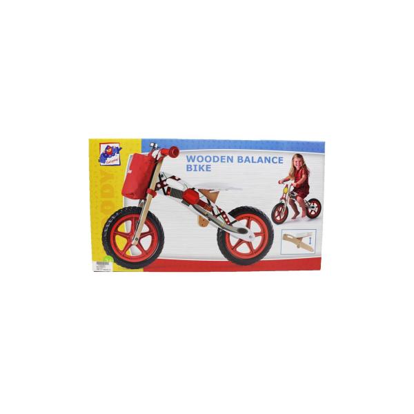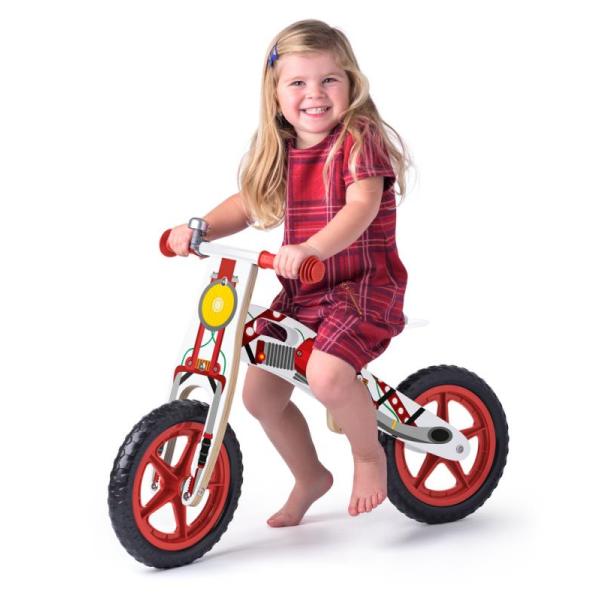 Odrážedlo z dřevěného materiálu v designu motorky v červeném provedení je skvělé pro přípravu na první jízdu na kole.
