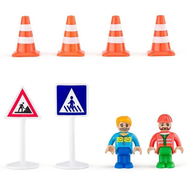Dřevěná autíčka jako sada stavebních strojů doplněná o plastové doplňky a figurky s pohyblivými klouby. Obsahuje: 4x stavební stroje 4x kužel 2x značky 2x postavička Věk: 3+