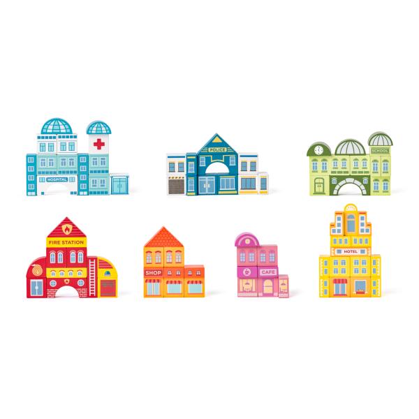 Otevři kyblík plný barevných dřevěných kostek v jedinečném designu české výtvarnice a postav si vlastní město plné života! Vytvoř hasičskou a policejní stanici, nemocnici, školu, kavárnu i obchod. Nech ulicemi projíždět auta, vrtulník kroužit nad městem a plnit své úkoly. Podkladová deska z puzzle dílů dotvoří dokonalou scénu pro tvé příběhy!