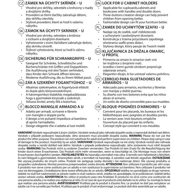ZOPA bezpečnostní prvky pro ochranu dětí v prostředí vašeho domova • Vhodné pro skříňky, sekretáře a knihovny s držadly a dvojitými dvířky • Provedení se dvěma tlačítky dětem zabrání v tom, aby skříňku otevřeli • Pro dospělého je použití pohodlné a jednoduché • Neobsahuje BPA a ftaláty