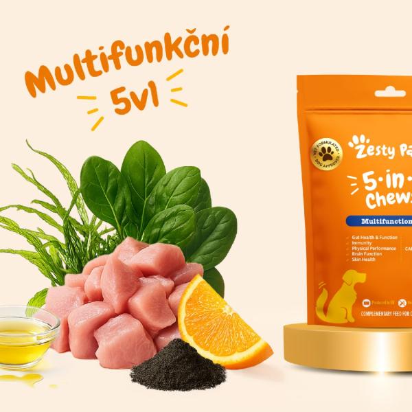 Podpořte každodenní vitalitu a pohodu svého psa se Zesty Paws 5-in-1 Chews. Tyto prémiové multiFUNKČNÍ doplňky výživy pro psy, vyvinuté ve spolupráci s veterináři, spojují skvělou chuť, hravou formu podávání a pečlivě vybrané ingredience. Funkční složení s patentovanou složkou Calsporin® napomáhá přirozeným tělesným funkcím – od správné činnosti mozku a imunitního systému až po rovnováhu střevní mikroflóry, která souvisí se zdravou pokožkou a udržováním fyzické kondice.