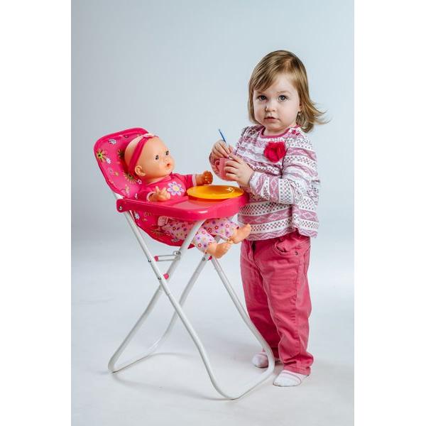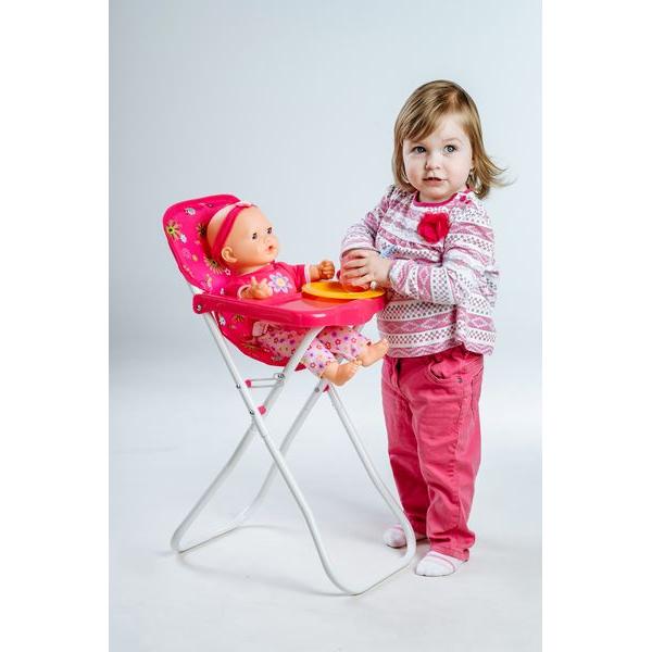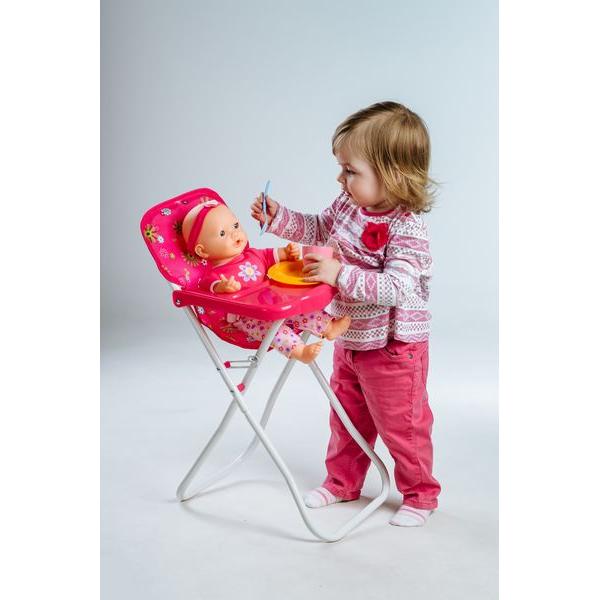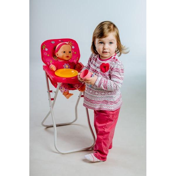 Vysoká židle se stolkem, ve které si mohou holčičky svou panenku nakrmit. Velikost: 33 x 26 x 60 cm. Vhodná od 3 let.