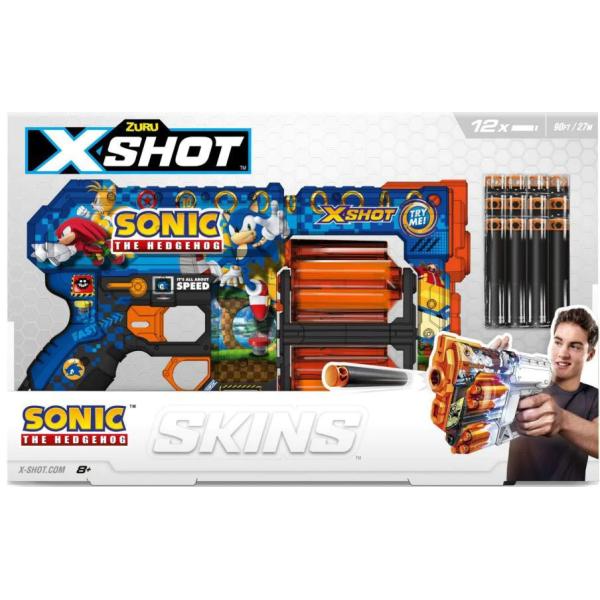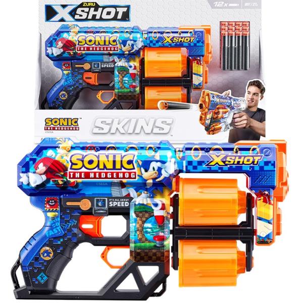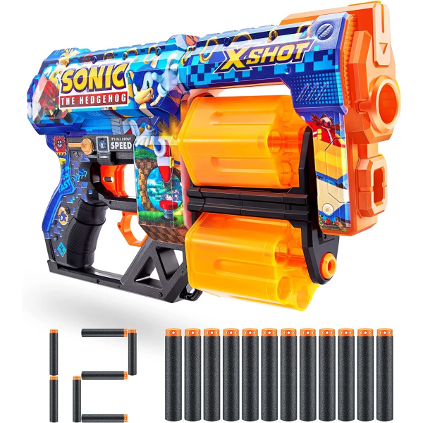 Vyberte si kůži Sonic the Hedgehog a zapojte se do boje se Sonicem, Tails a Knuckles. S kapacitou 12 šipek, dvojité problémové otáčení hlavně X-Shot Skins Dread znamená, že jste zamknutí a nabití pro zábavu. Když vám dojdou šipky v jednom sudu, přepněte se na druhý a odstřelte soutěž ze vzdálenosti až 27 m / 90 stop.