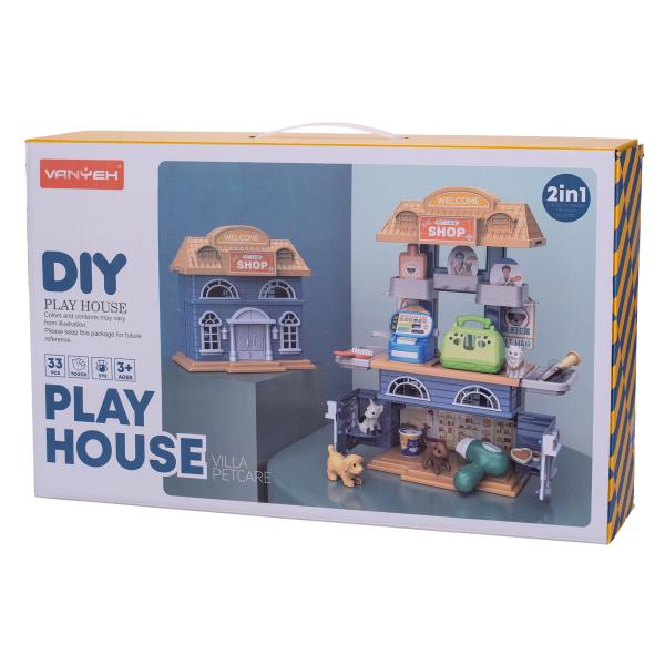 Dvojnásobná zábava! Otevři dveře do světa péče a obchodu se zvířátky! Děti se mohou hrát na starostlivého ošetřovatele v domečku, nebo na prodavače v obchodě.